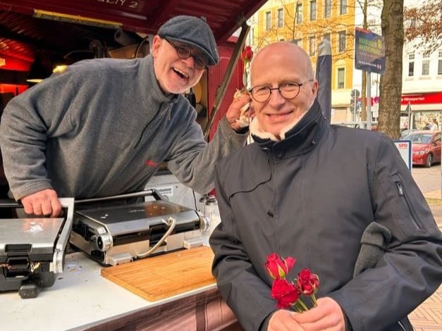 Mit viel Charme überreichte der Bürgermeister auch den geduldig in den Schlangen Wartenden und dem fleißigen Verkaufspersonal eine Rose – eine Geste, die überall auf Begeisterung stieß. Besonders berührend war die Begegnung mit einem Kaffeestandbetreiber, der stolz von seiner 50-jährigen SPD-Mitgliedschaft erzählte.